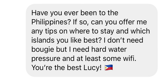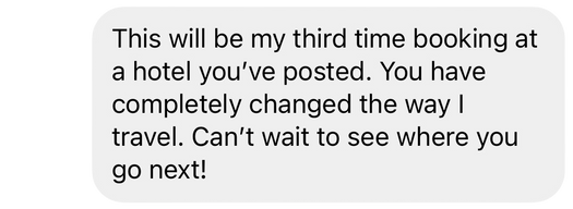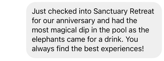 "Hi Lucy, We just wanted to let you know that we have had four bookings within 72 hours of you posting about us on your instagram! Your followers clearly listen when you tell them where to travel. Please come back and see us anytime. We are so grateful! Thank you!"